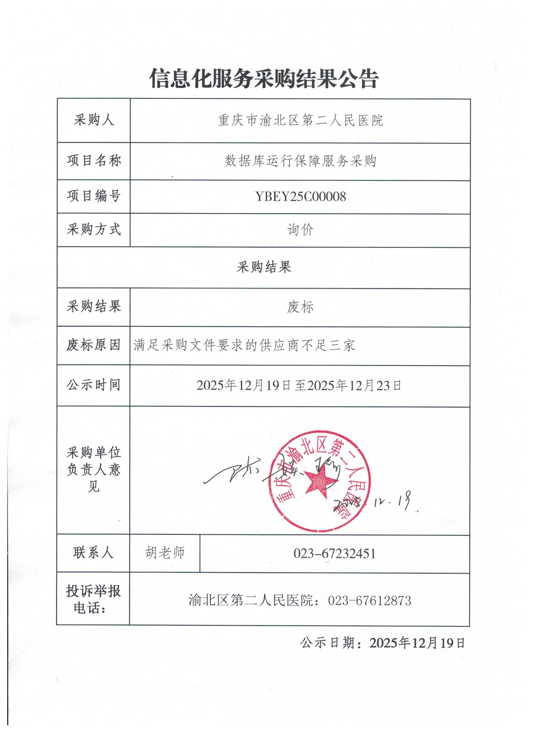 重庆市渝北区第二人民医院数据库运行保障服务结果公告