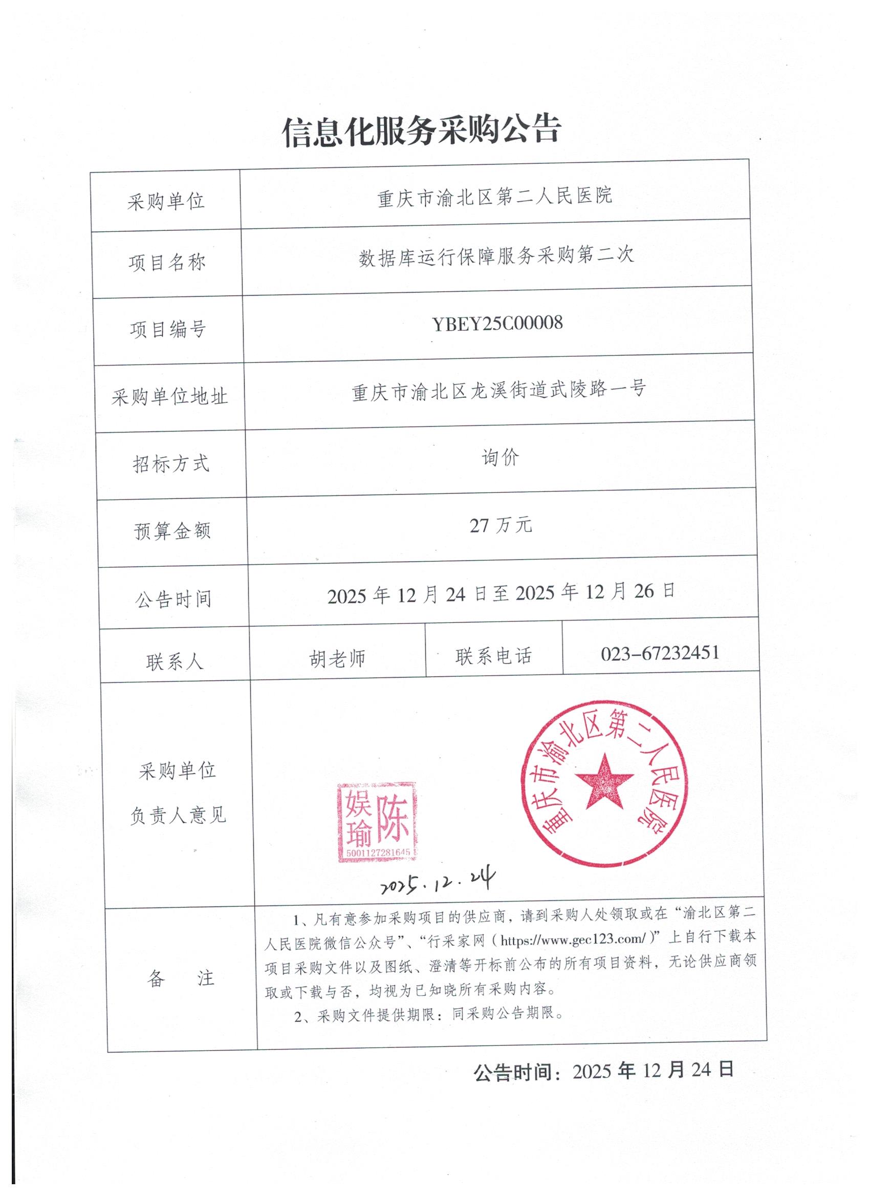 重庆市渝北区第二人民医院数据库运行保障服务采购公告